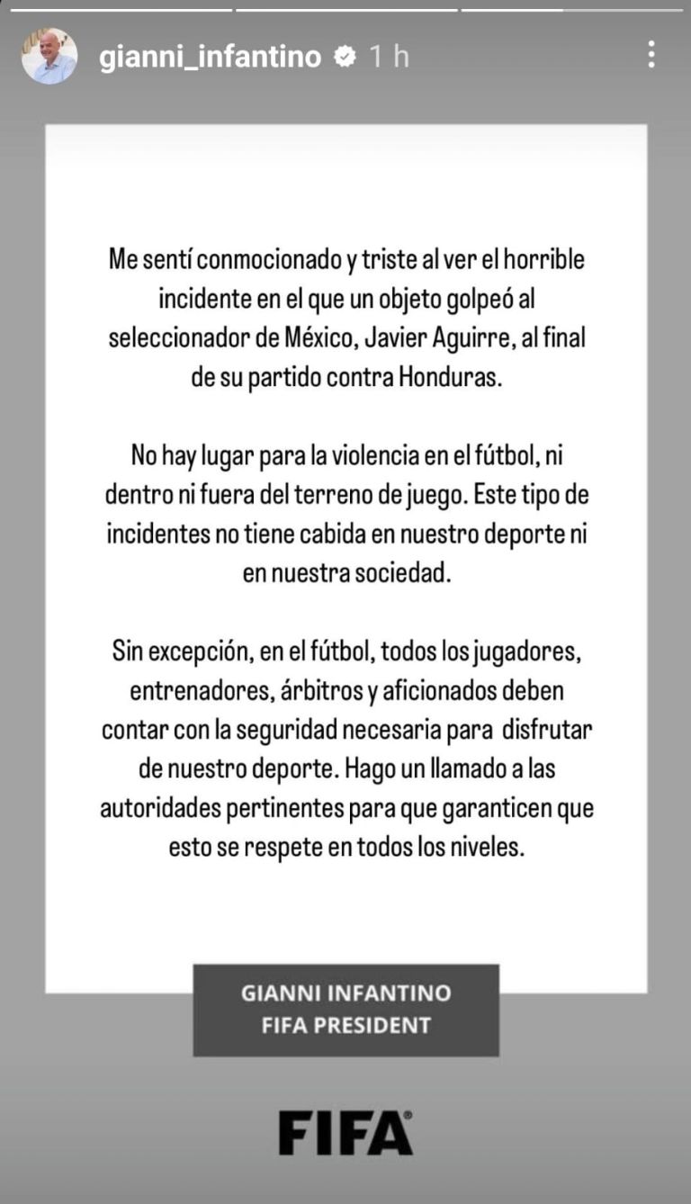 Gianni Infantino hizo un llamado a las autoridades a tomar las medidas necesarias para que se garantice la integridad de aficionados y equipos en cualquier estadio. El encuentro de la Nations League se celebró en el Estadio Francisco Morazán, el cual sobresale por separar las tribunas de la cancha con rejas de 2 o 3 metros en algunas secciones. Ni eso evitó que un aficionado impactara a Javier Aguirre en la cabeza con una lata de cerveza.