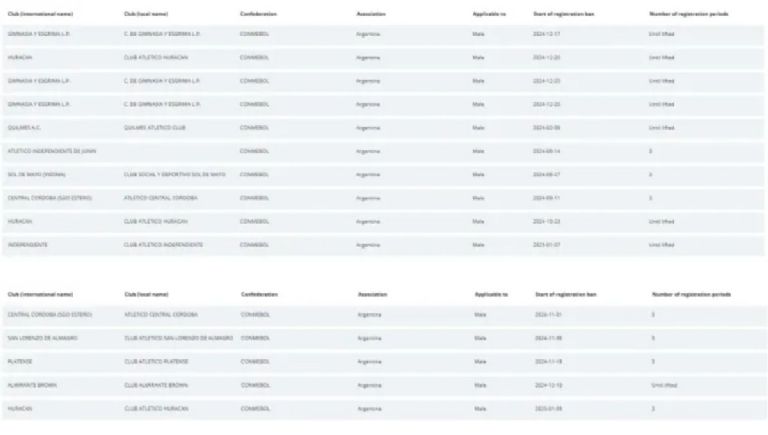 A través de su portal oficial, la federación explicó que la "Lista de Prohibiciones de Registro" incluye a clubes de todo el mundo que no pueden registrar nuevos fichajes temporalmente debido a disputas financieras u otros incumplimientos regulatorios.