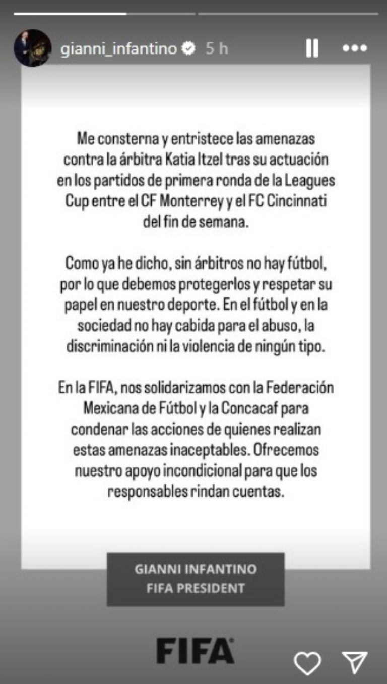 En una historia publicada en su cuenta oficial de Instagram, el presidente de la FIFA expresó su consternación por las amenazas recibidas por Katia Itzel: