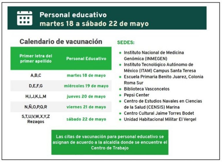 El pasado jueves 14 de mayo fue el último día de registro, sin embargo, en videoconferencia las autoridades indicaron que aquellos que no se registraron pueden pedir a su Centro de Trabajo Educativo que los registren antes del jueves 20 a las 12:00. Así, el viernes 21 podrán acceder al sistema para saber su hora y lugar de cita del día 22 de mayo, día en que se vacunarán a los rezagos.