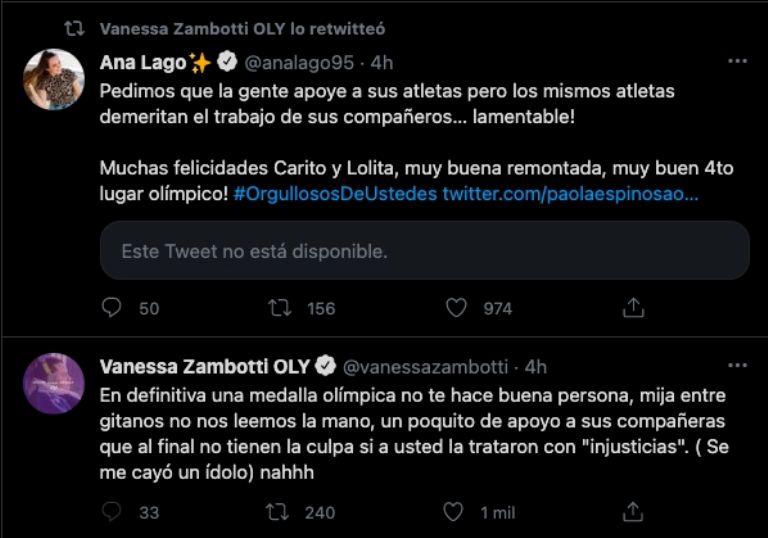 Varios atletas mexicanos -entre ellos Vanessa Zambotti, Ana Lago y Gloria Murillo- se unieron contra la medallista olímpica por no mostrar empatía con sus compañeras y cuestionar su actuación en los Juegos Olímpicos de Tokio 2020, a los que no pudo llegar por cuestiones administrativas.