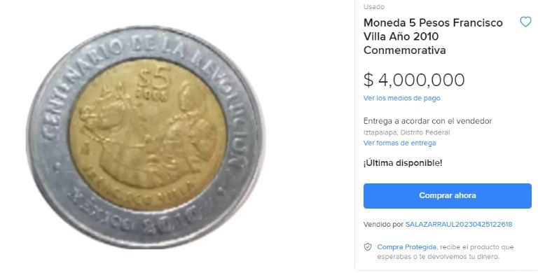 Existen algunas plataformas especializadas en México que, dentro de sus diversas alternativas de comercio digital, el mundo de la numismática funge como su punto más fuerte. Un ejemplo de su impacto es precisamente esta moneda de 5 pesos, la cual es conmemorativa y la cual tiene un precio al público de…¡4 millones de pesos!