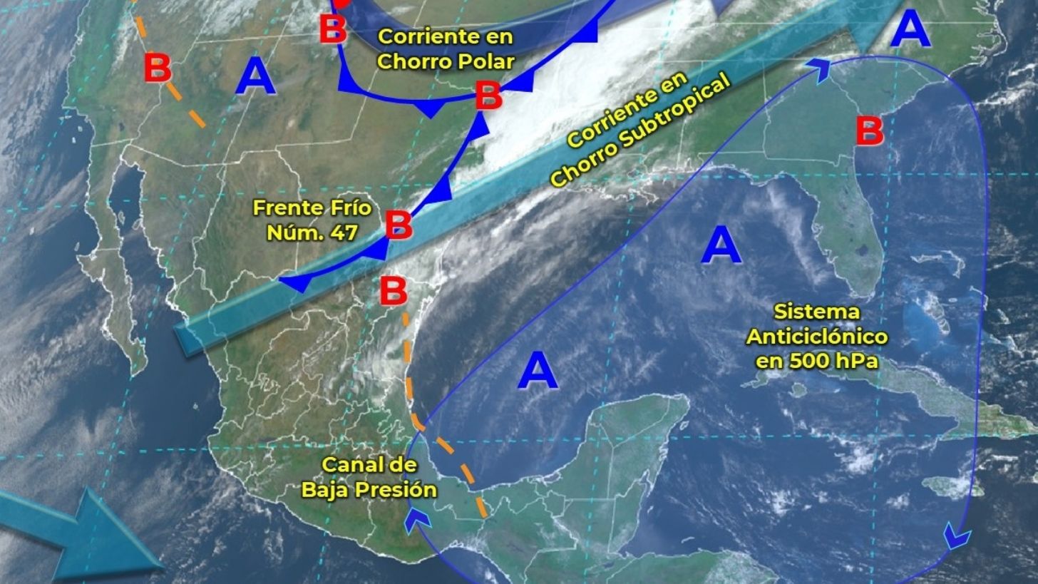 Aunque el ingreso de humedad del Golfo de México y Océano Pacífico originará lluvias e intervalos de chubascos en el sureste mexicano en combinación con el frente frío 47, una onda de calor continuará en gran parte de la República Mexicana con ambiente caluroso a extremadamente caluroso en el estados del occidente, noreste, oriente, sur, sureste y centro del país, además de la Península de Yucatán y el Valle de México, con temperaturas máximas superiores a 40 grados en Nayarit, San Luis Potosí, Jalisco, Colima, Guerrero, Michoacán, Morelos, Oaxaca, Veracruz, Chiapas, Campeche, Tabasco y Yucatán.