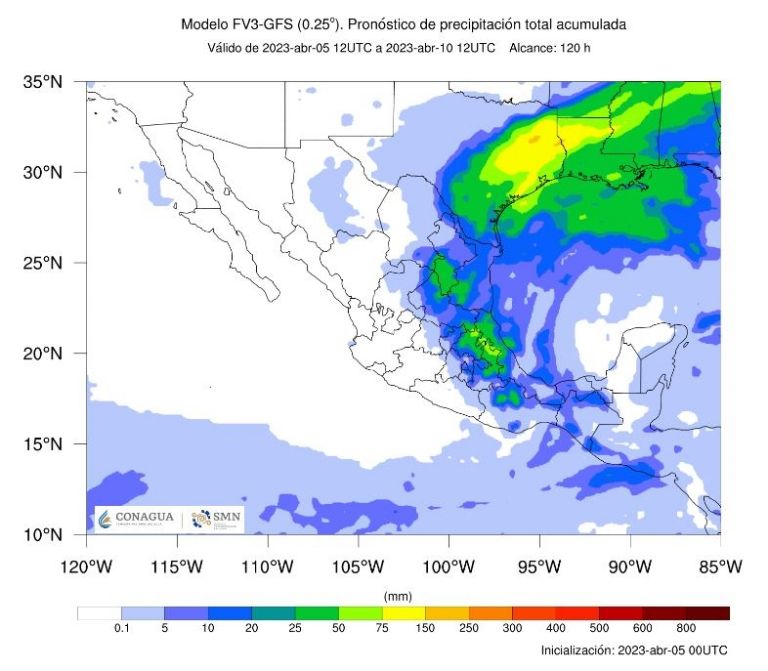 Del 6 al 9 de abril, no obstante, el frente frío 47 se extenderá este jueves sobre oriente y noreste de territorio nacional, con lluvias fuertes a muy fuertes, posibles granizadas y hasta descargas eléctricas, así como tormentas intensas en San Luis Potosí, Nuevo León, Tamaulipas, Hidalgo, Veracruz y Puebla, además de torbellinos en Tamaulipas, Coahuila y Nuevo.
