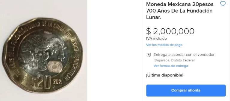 Son muchos y muy variados los artículos relacionados a la numismática que aparecen en las principales plataformas de internet gracias al crecimiento que el mercado ha tenido últimamente. No obstante, ninguno de estos destaca tanto como esta moneda de 20 pesos de los 700 años de la Fundación Lunar, misma por la que ofrecen 2,000,000 de pesos.