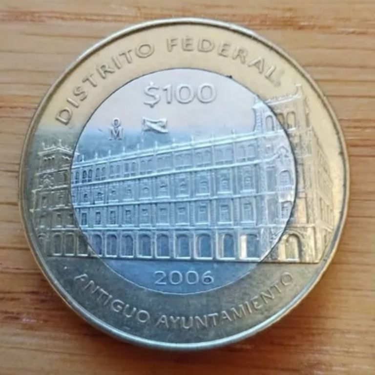 En Mercado Libre, ofrecen una moneda conmemorativa de 100 pesos de Antiguo Ayuntamiento en 30,000 pesos. En la sección de características se puede leer que la emitieron en el año 2006 y que el material de la que está hecha es cuproníquel/cuproaluminio.