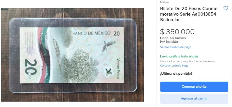 Lamentablemente para la causa de los coleccionistas, el propietario que vende este billete de 20 pesos en 350 mil pesos establece que no cuenta con el certificado de no circulación, aunque asegura que este es totalmente nuevo dado que, hasta ahora, no ha circulado. Si tienes interés de adquirirlo, únicamente tienes que buscarlo en la plataforma Mercado Libre.