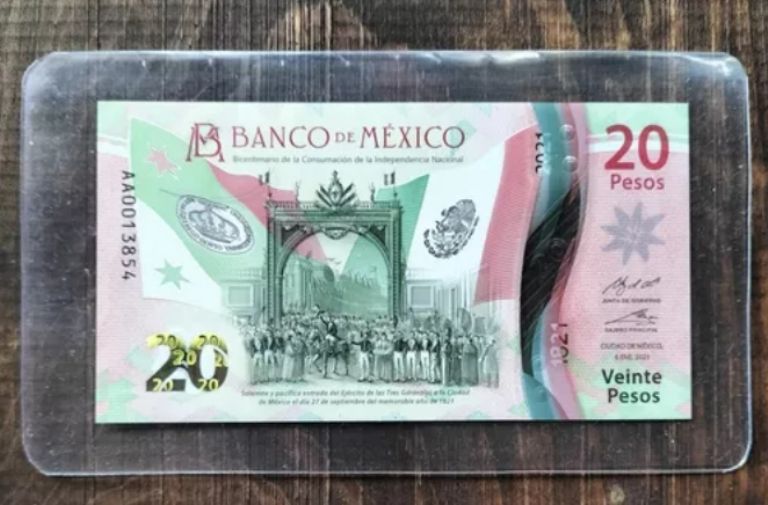 El dueño de este billete de 20 pesos establece que es conmemorativo al Bicentenario de la Independencia de México teniendo una fecha de emisión del 24 de septiembre del 2021. Una de sus características principales es que su número de serie es AA0013854, motivo por el cual el mismo pertenece a la ya conocida Familia G.