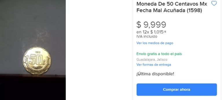 Es en Mercado Libre, plataforma especializada en la compra y venta de artículos relacionados a la numismática, que el dueño de esta moneda de 50 centavos la vende en nueve mil 999 pesos; es decir, prácticamente 10 mil pesos. Vale mencionar que el propietario habita en la Ciudad de Guadalajara Jalisco y no en el centro del país como ocurre en la mayoría de los casos.