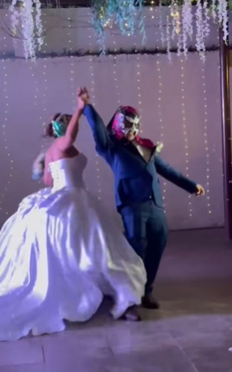 Los invitados quedaron sorprendidos cuando vieron llegar a la pareja muy bien combinados con sus máscaras de dos de los personajes de AAA.
