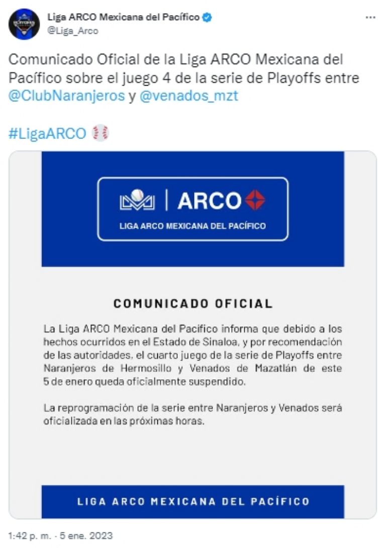 “La Liga ARCO Mexicana del Pacífico informa que, debido a los hechos ocurridos en el estado de Sinaloa, y por recomendación de las autoridades, el cuarto juego de la Serie de Playoffs entre Naranjeros de Hermosillo y Venados de Mazatlán queda oficialmente suspendido (…) La reprogramación de la Serie entre Naranjeros y Venados será oficializada en las próximas horas”, menciona el comunicado.