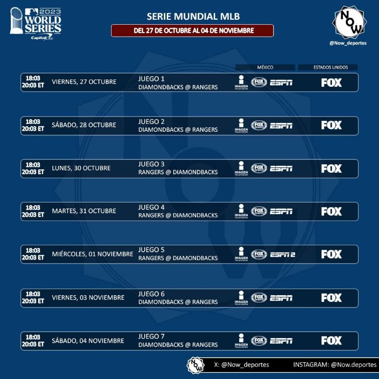 ¡Llegó la hora!.. Luego de una temporada regular de alarido y aderezada por escándalos como el de Julio Urías con Los Angeles Dodgers, finalmente dará inicio la Serie Mundial cuando este viernes 27 de octubre se realice el Arizona Diamondbacks vs Texas Rangers, Juego 1 por el título de la Major League Baseball (MLB) que aquí te decimos qué canal lo transmite.