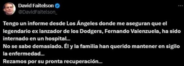 “Tengo un informe desde Los Ángeles donde me aseguran que el legendario ex lanzador de los Dodgers, Fernando Valenzuela, ha sido internado en un hospital… No se sabe demasiado. Él y la familia han querido mantener en sigilo la enfermedad… Rezamos por su pronta recuperación…”, escribió David Faitelson. Fernando Valenzuela dejó recientemente las transmisiones de la novena angelina por causas desconocidas.