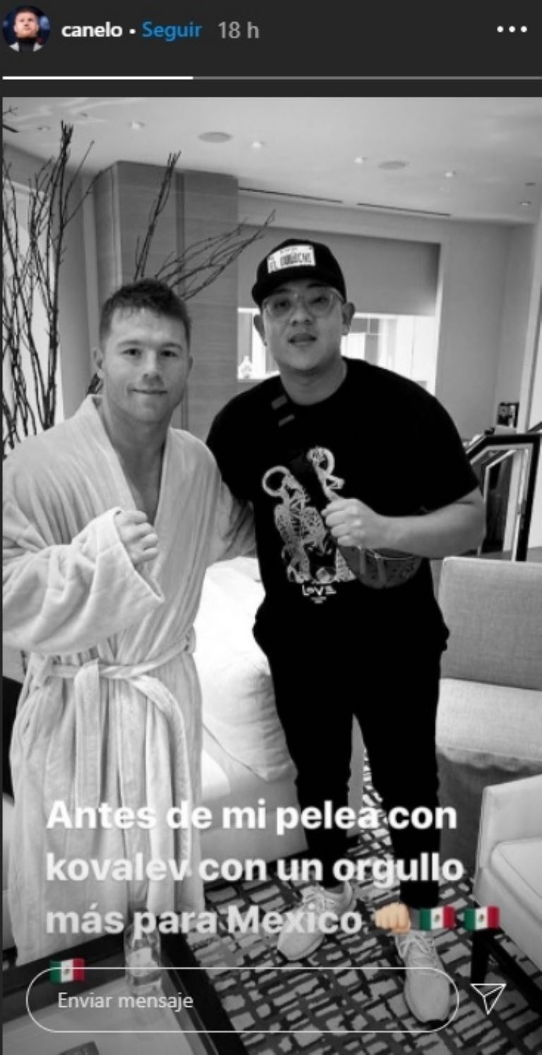 En la imagen compartida en sus Instagram Stories, se puede ver al 'Canelo' en bata, a lado de Urías, acompañado del mensaje: "Antes de mi pelea con Kovalev, con un orgullo más para México".