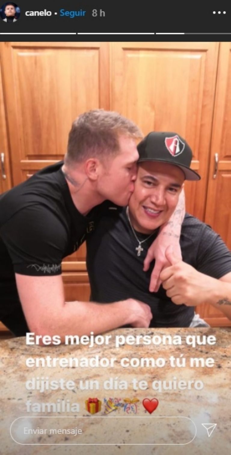 En la segunda 'Canelo' aparece dándole un beso en la mejilla a Reynoso, además de un emotivo mensaje por la celebración al considerado mejor entrenador de boxeo de la actualidad.
