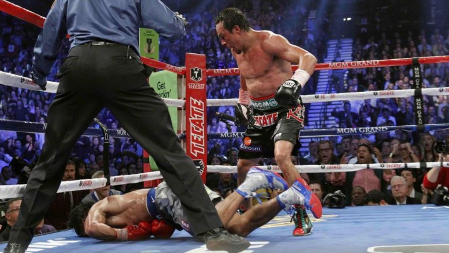Márquez tardó en reaccionar al ver el cuerpo de Manny Pacquiao tendido en la lona. Fue hasta que el réferi sacudió la mano para darle fin a una contienda, la cuarta y última, en la que el deporte le hizo justicia a Juan Manuel, que regaló una imagen para el recuerdo, hoy hace ocho años.