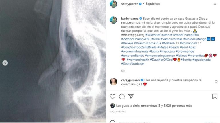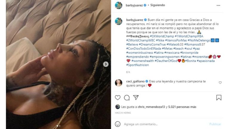 Buen día mi gente ya en casa Gracias a Dios a recuperarnos, mi nariz si se rompió pero no quise abandonar di lo que tenía que dar en el momento y agradezco a papá Dios sus fuerzas porque se que son las de el y no las mías", escribió la boxeadora en su cuenta oficial del Instagram.
