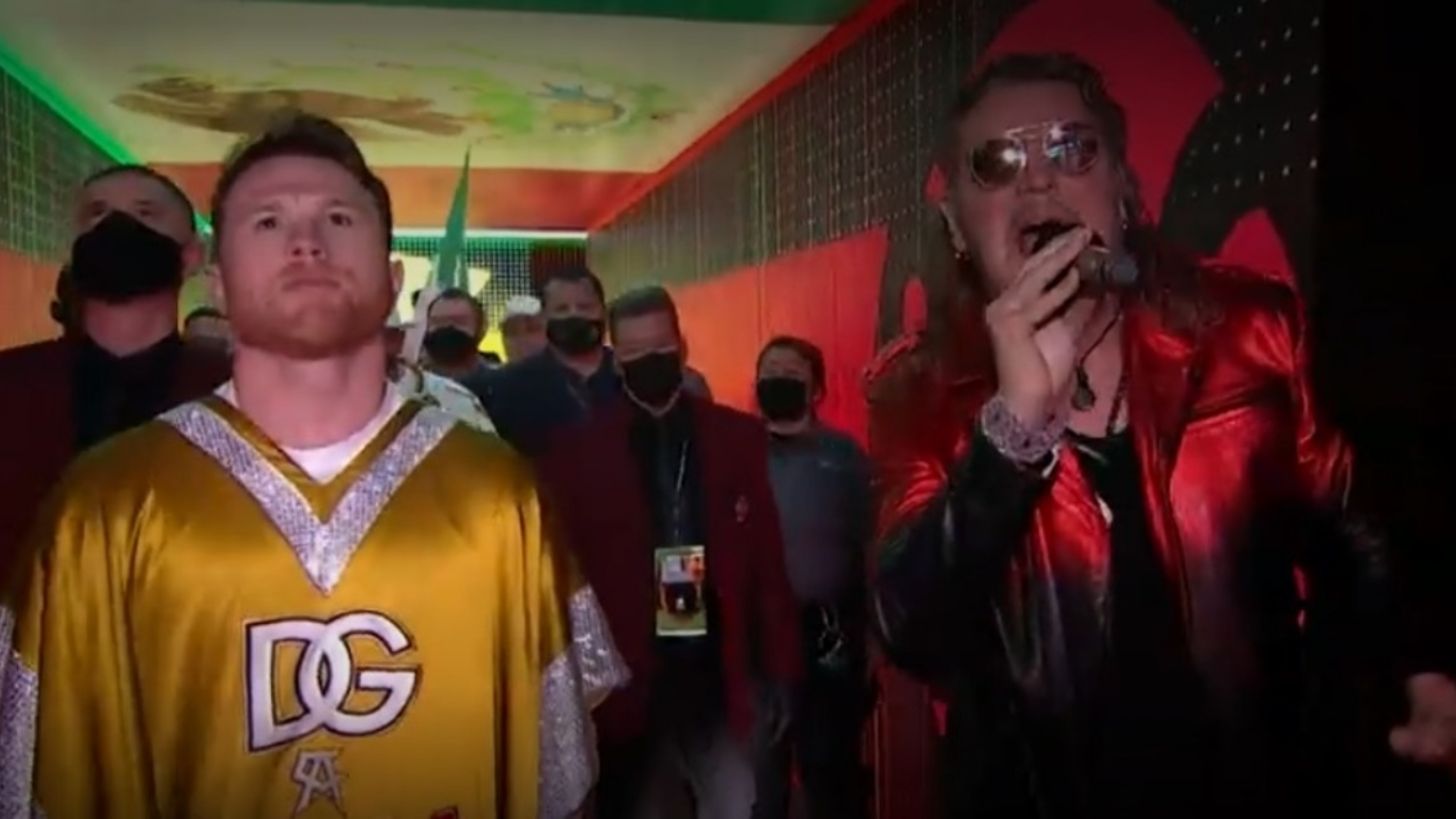El cantante y líder de la popular banda Maná, Fernando Olvera, fue quien cantó durante la presentación de Saúl Álvarez, quien salió portando un lujoso poncho de Dolce & Gabbana.
