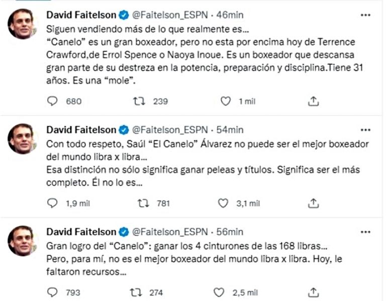 A través de redes sociales, el periodista de ESPN lanzó desacreditaciones y opiniones, en las expresaba que Canelo no es el mejor libra por libra o no merece el título indiscutido de los Supermedios.