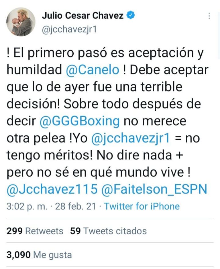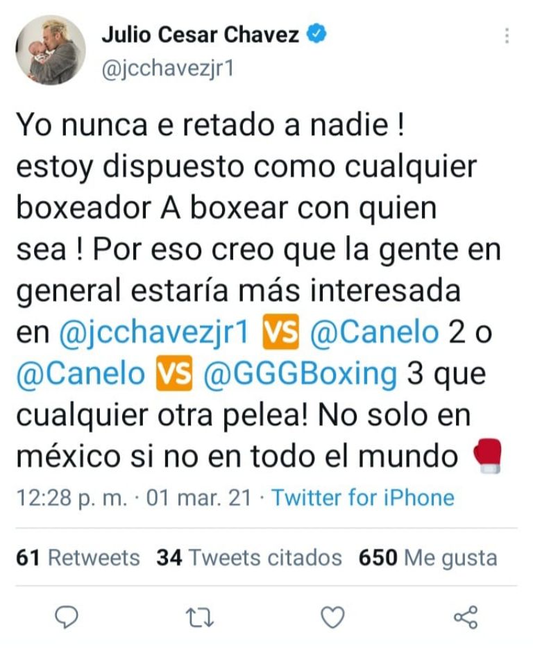 A través de su cuenta de Twitter, Chávez aseguró que nunca ha retado a nadie, pero se dijo listo para pelear ante Canelo, quien ya lo venció por decisión unánime en 2017 en un combate donde se vio ampliamente superior.