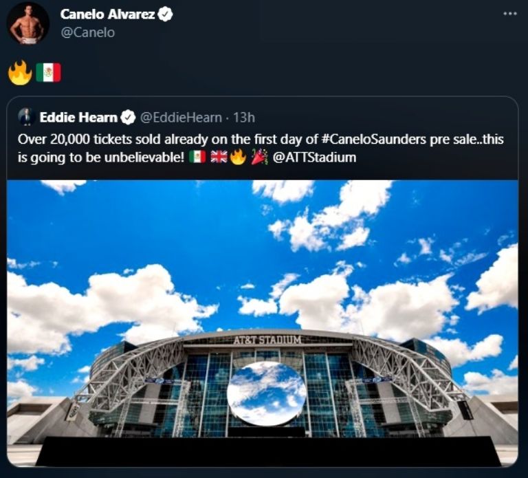 También Canelo Álvarez mostró su euforia por este gran primer día de preventa de boletos para su combate ante Saunders. En redes sociales, citó el mensaje de Hearn sobre las 20 mil entradas vendidas con un par de emojis donde se ve también reflejada su expectativa.