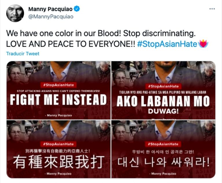 A través de sus redes sociales, 'Pac-man', el único boxeador en la historia en conquistar títulos en ocho diferentes categorías de peso, fijó su postura en diferentes idiomas y denunció la gran cantidad de crímenes relacionados con el odio en contra de la comunidad asiática, a la cual pertenece.