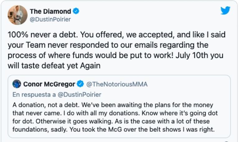 Al tanto de las declaraciones de su rival, McGregor explotó. Una vez enterado de su acusación, el irlandés dijo que "era una donación y no una deuda", previo a comentar que por el momento la pelea estaba cancelada.
