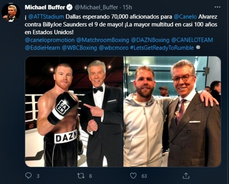 "¡Dallas esperando 70,000 aficionados para Canelo Álvarez contra Billy Joe Saunders el 8 de mayo! ¡La mayor multitud en casi 100 años en Estados Unidos!", expresó Buffer en una publicación hecha en su cuenta de Twitter, en un claro español.