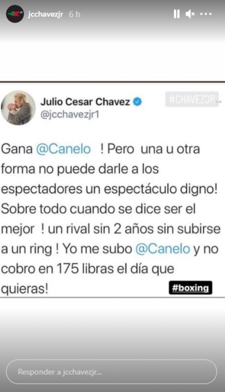 Tal fue el caso de Julio César Chávez Jr. quien por medio de sus Instagram Stories, recordó un mensaje publicado en su cuenta de Twitter, donde señalaba la falta de espectáculo.