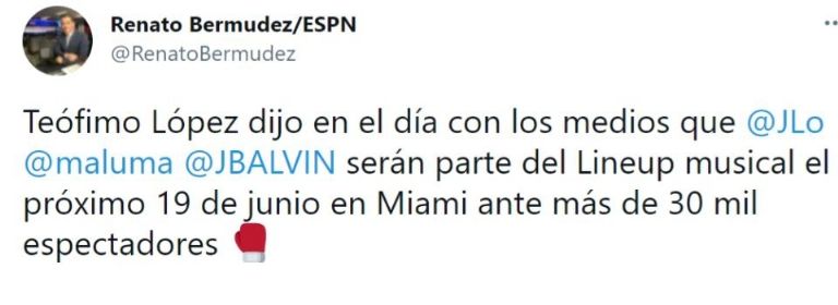 Teófimo López dijo en el día con los medios que @JLo, @maluma y @JBALVIN serán parte del Lineup musical el próximo 19 de junio en Miami ante más de 30 mil espectadores", escribió el periodista.