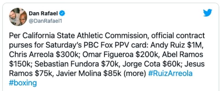 Asimismo, el organismo precisó que Ruiz obtuvo la cantidad de un millón de dólares por haber aceptado medirse contra Arreola. La cantidad contrasta con lo que 'Destroyer' se embolsó contra Anthony Joshua, quien le arrebató los campeonatos de peso completo.