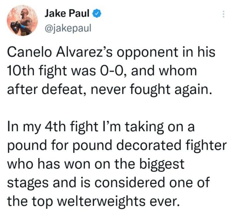 "El décimo oponente de Canelo Álvarez estaba 0-0 y después de perder, nunca volvió a pelear. En mi cuarta pelea voy a ir contra un libra por libra decente que ha ganado en los escenarios más grandes y es considerado como uno de los mejores wélters del mundo", escribió en Twitter.