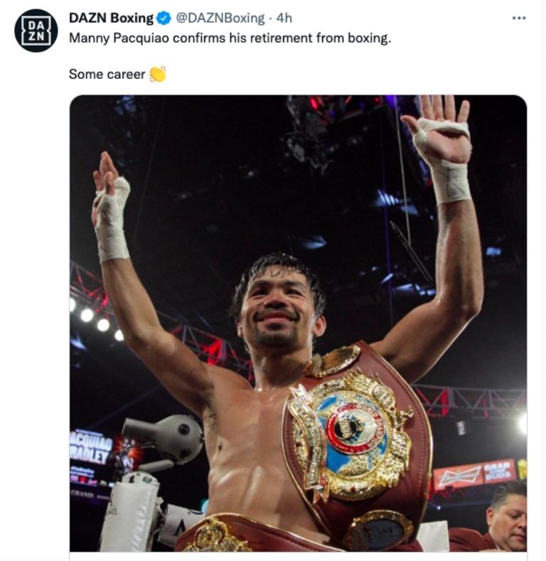 “Mi carrera en el boxeo ya terminó”, adelantó Pacquiao, y agregó que “Sucede porque he estado en el boxeo durante mucho tiempo y mi familia dice que es suficiente”.