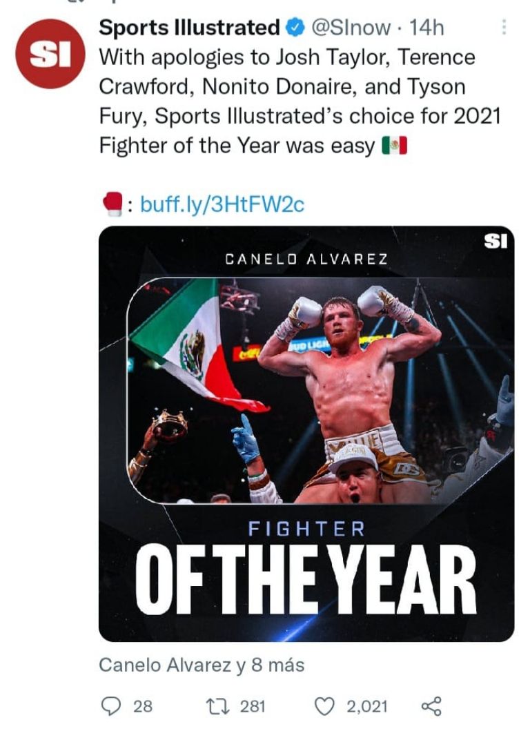 Saúl Canelo Álvarez ha iniciado con el pie derecho este 2022 sin necesidad de subirse todavía aun ring. Y es que mexicano fue nombrado como el mejor boxeador del 2021 por Sports Illusttrated, revista de Estados Unidos con más de 3 millones de suscriptores.