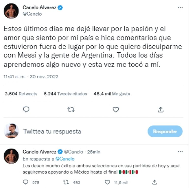 El considerado mejor boxeador mexicano de la actualidad confirmó que se resintió tanto por la presión como por el amor que siente por México, lo cual hizo que protagonizara comentarios fuera de lugar en el mundo digital. Posteriormente, no tuvo reparo en disculparse con Lionel Messi y su país de origen no sin antes mencionar que, de este tipo de errores, se aprende.