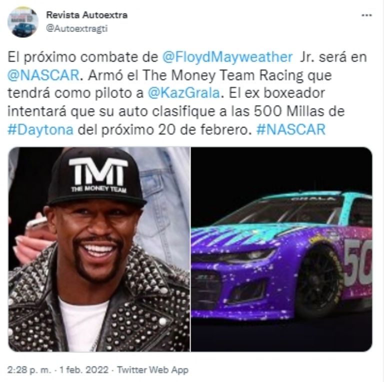 “Me encantan los coches rápidos y me encanta competir. Sé que NASCAR no será fácil, pero no vale la pena hacer nada fácil (...) Dicho esto, este paso a las carreras de autos parece encajar perfectamente con la marca Mayweather”. subrayó Floyd.