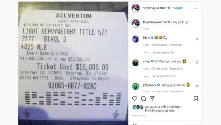 A través de redes sociales, Floyd Mayeweather presumió la cifra que apostó en contra de Saúl Canelo Álvarez. En su instagram se puede ver el ticket como comprobante de los 10 mil dólares que puso sobre la mesa. Dicha cantidad se podría hasta quintuplicar porque los momios favorecían al mexicano, quien iba invicto en 16 peleas y tiene en su posesión el título de campeón indiscutido de los pesos supermedianos. Pero no fue suficiente.