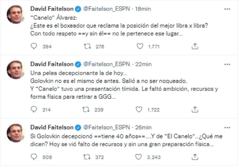 El periodista de ESPN ha sido uno de los más duros críticos del pugilista campeón indiscutido de los supermedios, que esta vez defensió sus cuatro fajines de los puños de GGG. Pero Faitelson no quedó conforme y alzó la voz en redes sociales para ir de nueva cuenta en contra de Canelo.