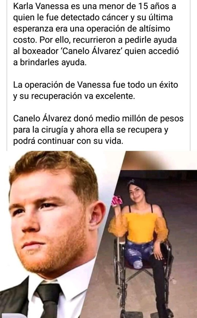 - En 2021, respondió al llamado de ayuda que le hizo la pequeña Karla Vanessa, de 15 años, quien necesitaba costear una operación de pulmón con carácter de urgente, ya que desde 2019 le fue diagnosticado un tipo de cáncer por el que ha tenido que someterse a más de una veintena de quimioterapias. Lo increíble es que en menos de cinco minutos Canelo Álvarez ya había respondido por Twitter a la joven con la frase: “¡Un número telefónico!”, a la espera de que el mejor libra por libra del mundo le entregue -literalmente- la oportunidad de vivir a la adolescente.