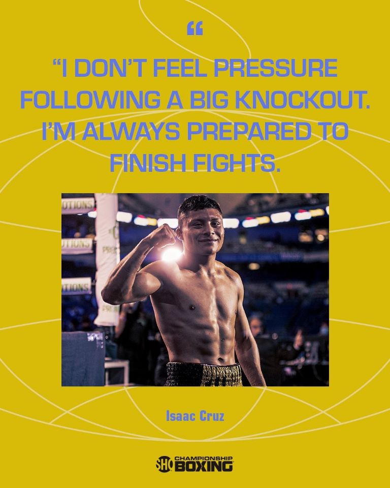 Pitbull Cruz (25-2, 17 nocauts) subirá a las 140 libras para su primera oportunidad por el título en toda regla ante Rolly Romero, quien hizo su debut profesional el 2 de diciembre de 2016,? logrando una victoria por nocaut técnico en el primer asalto contra David Courtney en el Sam's Town Hotel and Gambling Hall en Sunrise Manor, Nevada, y acumuló un récord de 8-0 durante los siguientes tres años, ganando todas menos una de esas peleas por nocaut.