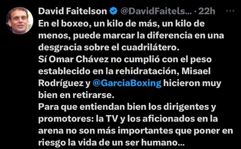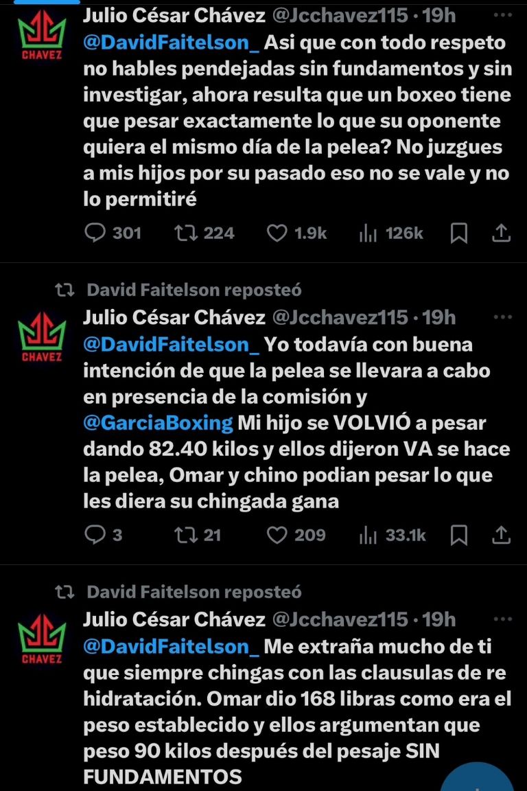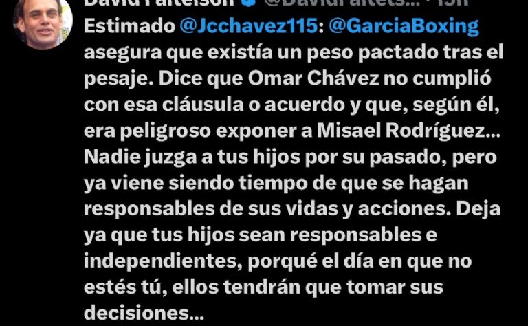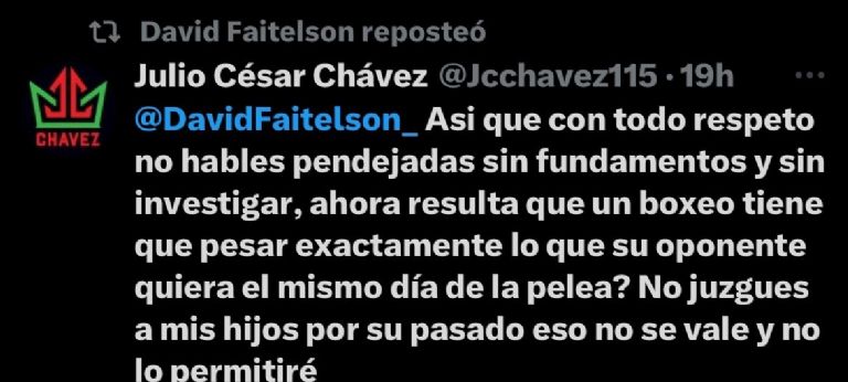 David Faitelson publicó a través de su cuenta official de X, donde aseguró que los hijos del Julio César Chávez, Omar y el Junior, no han llevado una vida como profesionales, incluso aseguró que, Mauricio Sulaiman habría justificado las indisciplinas de estos dos pugilistas, y añadió que él conoce a Robert García, y lo catalogó como un hombre con honor.