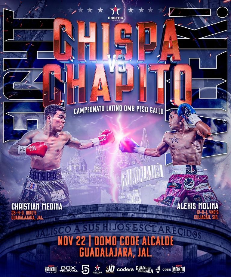 Todo arrancará este viernes 22 de noviembre cuando Christian Mejía se mida a Alexis Molina en Guadalajara por el título latino gallo de la OMB. Christian parte como favorito gracias a ser el héroe local y su experiencia reflejada en el récord de 23 victorias (16 KO) y 4 derrotas, mientras su oponente registra foja 12-0-1 (4 KO). Este pleito coronará una velada llena de peleas entre jóvenes promesas del boxeo tricolor.