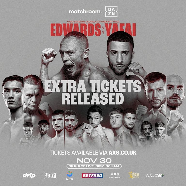 El sábado 30 de noviembre las acciones se trasladarán hasta Gran Bretaña donde Sunny Edwards se medirá a Galai Yafai en un choque dentro de la división mosca. El británico llegará motivado tras destrozar al mexicano Adrián Curiel y saldrá con todo para ganar el título interino del Consejo Mundial de Boxeo (CMB). Parte como el gran candidato a salir con el puño en alto gracias a ser local en el Resorts World Arena.
