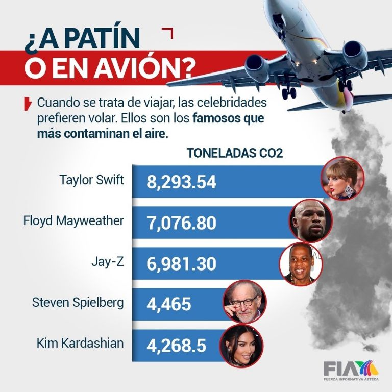 Se estima que la aviación es responsable de alrededor del 2 por ciento de las emisiones globales de CO2, algo que no ha detenido a estos cantantes, deportistas como Floyd Mayweather y artistas que siguen haciendo vuelos en avión sin importarles el daño que le hacen al planeta como los que más contaminan, encabezados por ni más ni menos que Taylor Swfit, quien incluso el próximo sábado viajará de Estados Unidos a Tokio para dar un concierto, luego del cual volverá a viajar a Las Vegas para ver a su novio Travis Kelce jugar el domingo en el Super Bowl LVIII.