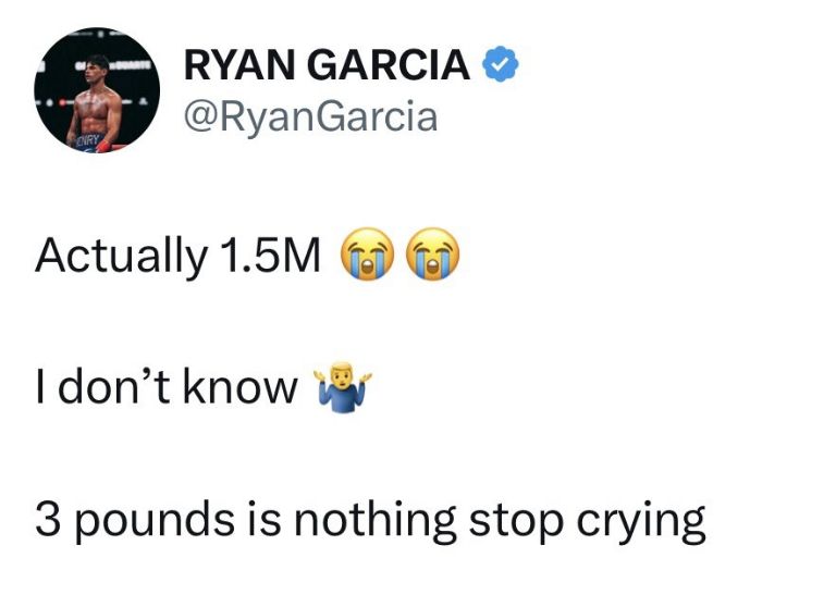 En el pesaje oficial privado, Ryan García no solo no dio el peso en la báscula para la pelea por el título superligero del CMB, sino que perdió de entrada 1.5 millones de dólares ante Davin Haney, con quien aposto en la conferencia de prensa previa 500 mil billetes verdes por libra de exceso para una pelea a la que el méxico-estadunidense se regocijaba de haber invitado a actriz porno, a pesar de que los NY Mets lo corrieron de su estadio.