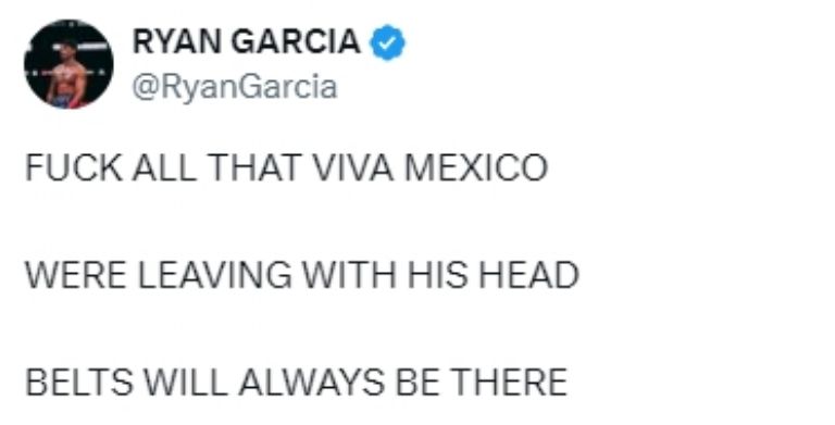 “Simplemente desperdicié tres horas para que al final nos dijeran que no podemos hacer el lanzamiento. No hubo motivo, nos echaron sin motivo… ¡Que se jodan los Mets! No volveré a ir nunca más a un maldito juego de los Mets. ¡Que se jodan los Mets!”, dijo Ryan García en un video que lanzó por sus redes sociales, las cuales también había utilizado para regocijarse de haber invitado a la actriz porno Savannah Bond a su pelea: “¡Ella dijo sí! Estoy muy feliz y motivado de entrar a mi pelea ahora. ¡Vamos! Es mi esposa o futura esposa, pero estoy muy feliz”.