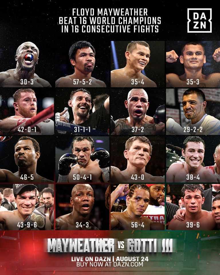 Ícono de íconos en la historia del boxeo internacional y uno de los tan solo dos boxeadores que han podido vencer al Canelo Álvarez (el otro es el ruso Dmitry Bivol), Floyd Mayweather Jr. tuvo una abucheada reaparición en tierras mexicanas al derrotar (aunque realmente no hubo decisión pues fue una pelea de exhibición) a John Gotti III que solo fue un bulto, en el que fue el tercer y sin duda definitivo combate entre ambos, realizado en la Arena CDMX.