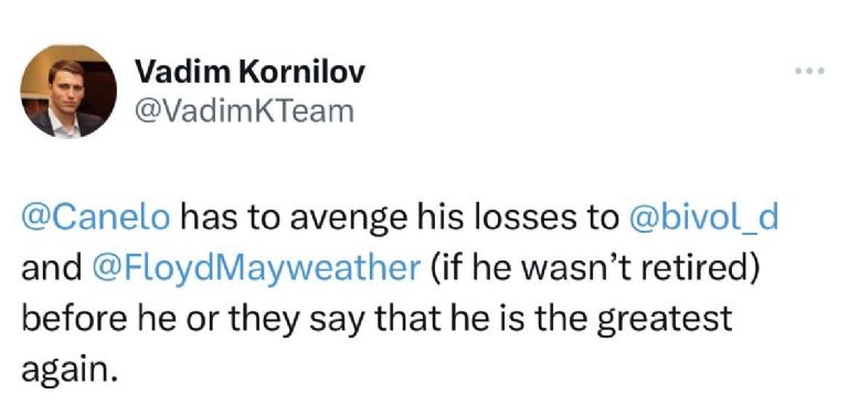 Fue Vadim Kornilov, manager de Dmitry Bivol, quien tundió a Canelo Álvarez tras asegurar primero debería vencer al ruso o a Floyd Mayweather (si estuviera activo), antes de volver a llamarse el mejor del mundo. Desde que el tapatío perdió en 2022 con el campeón semipesado no ha enfrentado a otro rival de primer nivel. Lo más cercano fue Gennady Golovkin, quien tenía 40 años cuando disputó la trilogía.