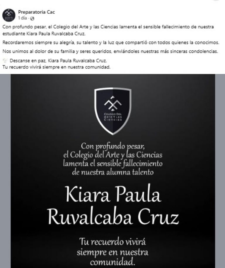 "Con profundo pesar, el Colegio del Arte y las Ciencias lamenta el sensible fallecimiento de nuestra estudiante Kiara Paula Ruvalcaba Cruz. Recordaremos siempre su alegría, su talento y la luz que compartió con todos quienes la conocimos. Nos unimos al dolor de su familia y seres queridos, enviándoles nuestras más sinceras condolencias. Descanse en paz, Kiara Paula Ruvalcaba Cruz. Tu recuerdo vivirá siempre en nuestra comunidad."