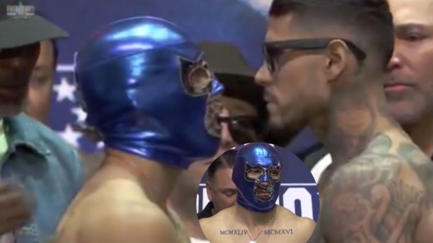 Una vez que salió a la tarima, volvió a quedarse enmascarado, subiendo a la báscula y luego realizando el típico cara a cara ante Arnold a Barboza Jr.